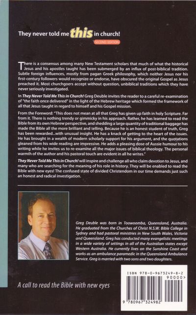 There is a consensus among many New Testament scholars that much of what the historical Jesus and his apostles taught has been submerged by an influx of post-biblical tradition. Subtle foreign influences, mostly from pagan Greek philosophy, which neither Jesus nor his first-century followers would recognise or endorse, have obscured the original Gospel as Jesus preached it. Most churchgoers accept without question, unbiblical traditions which they never seriously investigated. In They Never Told Me This in Church! Greg Deuble invites the reader to a careful re-examination of "the faith once delivered" in the light of the Hebrew heritage which formed the framework of all that Jesus taught in regard to himself and his Gospel mission.